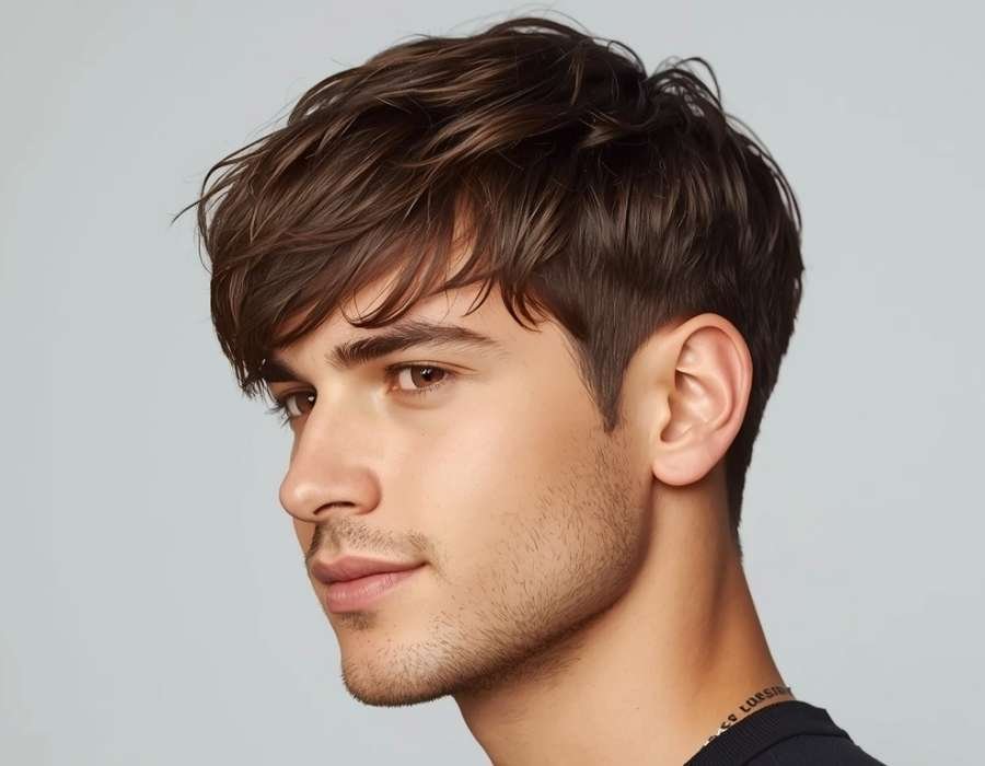 A gentle taper at the neck keeps the look clean, balancing texture with structure. Touches of honey or auburn highlights add depth, making the style more expressive and dimensional. This look suits youthful, creative types and pairs well with stubble or no facial hair, letting the fringe stay the focus while the overall vibe remains natural and effortless.
