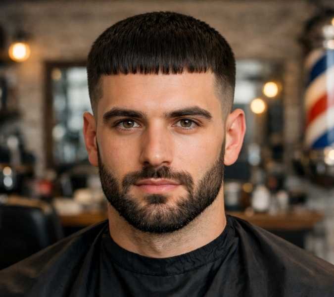 The caesar buzz cut delivers a clean, confident look that feels low-maintenance yet stylish, making this haircut easy to live with every day. It features evenly trimmed hair across the top with faded sides, creating a strong, modern profile that still feels balanced.